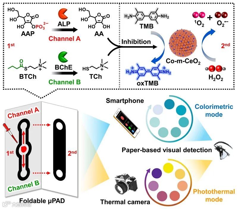 具体来说,该μPADs传感平台的操作由两个连续步骤组成。首先,利用钴掺杂介孔氧化铈(Co-m-Ce