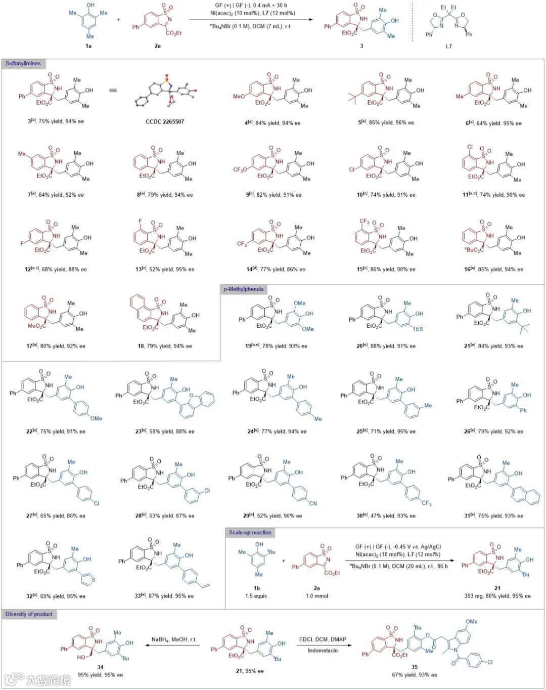 )-H键形成苄基自由基,同时将阴极还原与手性路易斯酸催化相结合,两种自由基中间体经过高效的不对称交叉偶联以高对映选择性实现磺酰亚胺的不对称烷基化反应
