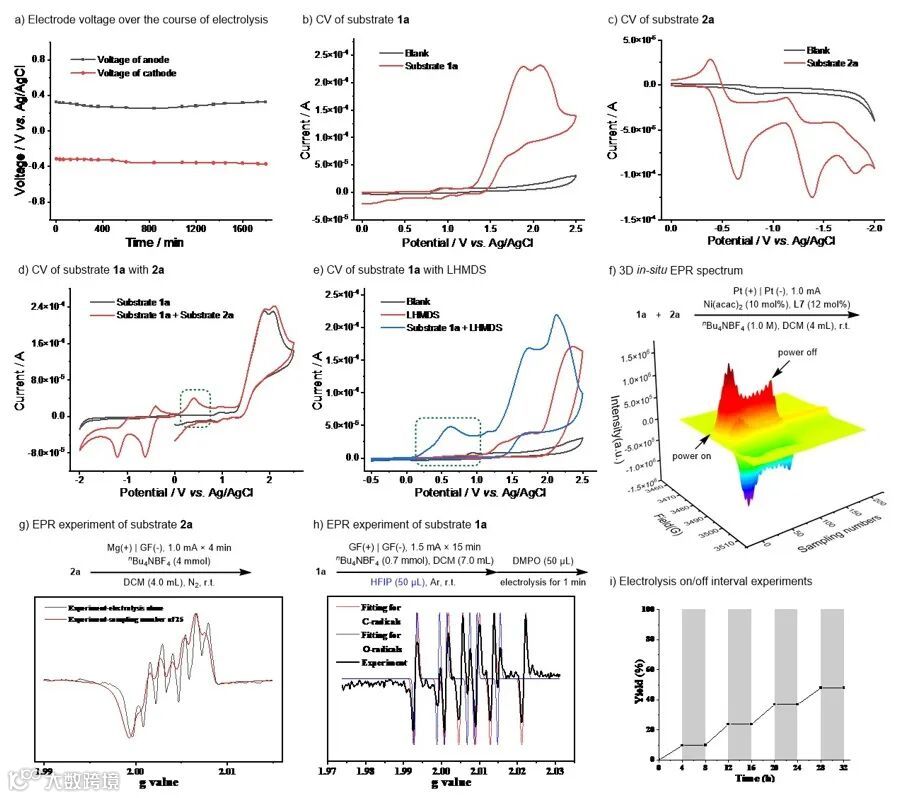 并用DMPO捕获自由基,可以通过EPR实验观察到明显的自由基信号。数据拟合表明,DMPO捕获了O自由基和C自由基两种自由基(图4h)。电解开/关实验说明连续电解是反应的必要条件(图4i)。