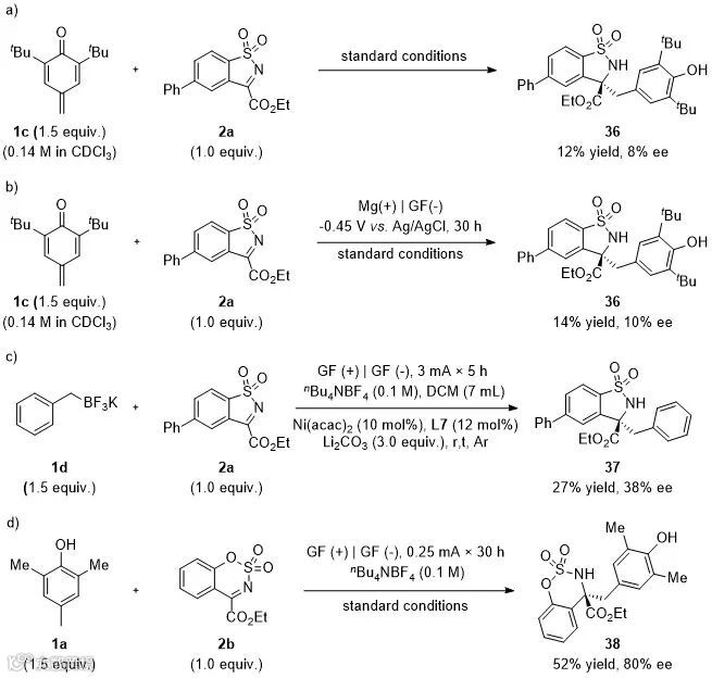 。因此醌类化合物可能并不是该反应中的关键中间体。另一方面,苄基三氟硼酸钾在电氧化条件下可以产生苄基自由基,在与磺酰亚胺反应时可以以38%的ee值和27%的产率的到目标产物(图5c),这也是自由基偶联过程的另一证据。此外,该体系也适用于具有六元环的其他磺酰亚胺(图5d)。