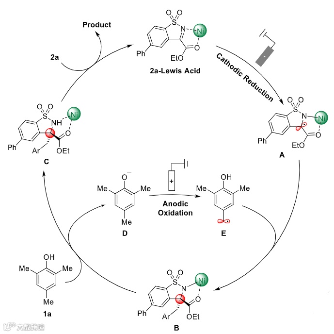 基于上述结果,作者提出了一种可能的机理(图7)。首先,磺酰亚胺与手性路易斯酸配位后在阴极还原形成自由基物种A。酚氧阴离子D在阳极单电子氧化后共振产生苄基自由基E,之后自由基交叉偶联形成中间体B,该中间体可以令三甲酚中酚羟基去质子化形成酚氧阴离子和中间体C,最后通过配体交换释放目标产物。
