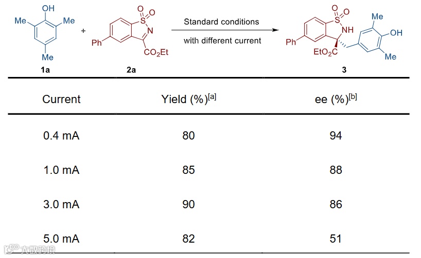实验发现产物的ee值随着电流密度的增加而降低(图6)。这表明通过适当的电流来调节阴阳极的反应速率对于反应的高对映选择性至关重要。