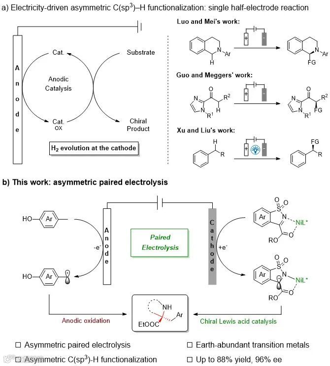 不对称电合成的潜力巨大,但是电解中产生的自由基等高活性中间体以及极性电合成体系与不对称催化体系的相容性使不对称电合成难以实现。到目前为止,所报道的不对称电合成体系几乎全部采用单电极反应,同时通过阴极析氢或牺牲阳极来确保反应体系电中性。相比之下,不对称配对电解同时活化两个电极上的反应物,在高原子经济性合成的基础上实现高对映选择性的控制十分具有挑战性。