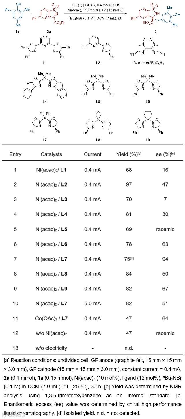 实现这一策略的关键是选择合适的手性Lewis酸催化剂和精准地控制氧化还原电位/电流。作者在反应条件优化中主要着眼于不同的Lewis酸、配体、电流等,最后在0.4 mA条件下使用Ni(acac