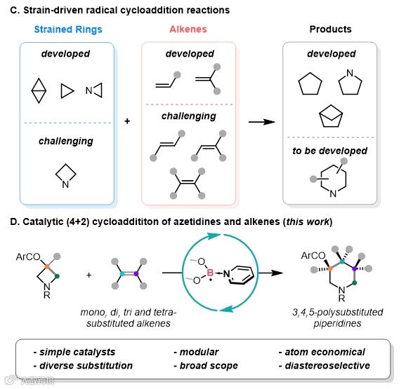导读:李鹏飞课题组利用硼自由基催化体系首次实现了氮杂环丁烷与多取代烯烃的自由基型(4+2)环加成反应,为多取代哌啶的高效、模块化合成提供了新的选择