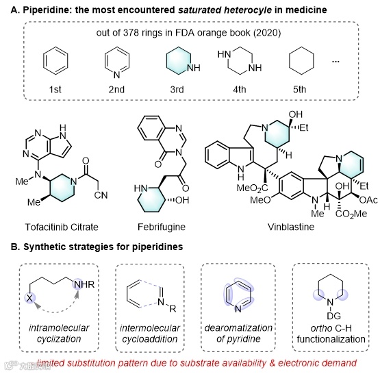 哌啶环是小分子药物中出镜频率最高的饱和环状结构,如何方便、高效地合成多取代哌啶一直是合成化学领域备受关注的研究方向之一(图1A)。根据反应原料和关键步骤的区别,目前已报道的合成策略基本可以分为以下四类(图1B):(1)分子内环化法;(2)以aza-Diels-Alder反应为代表的分子间环加成法;(3)吡啶去芳构化法;(4)简单哌啶分子的C-H键官能团化法。尽管这些策略为哌啶分子的合成提供了多种选择,但美中不足的是,上述方法在底物制备以及官能团兼容性上依然存在着各自的局限性,这在一定程度上限制了它们的应用范围,特别是3,4,5-位密集取代的哌啶分子的高效合成依然是一个巨大的挑战。