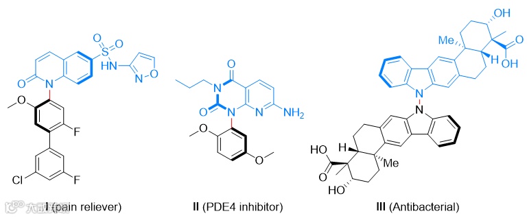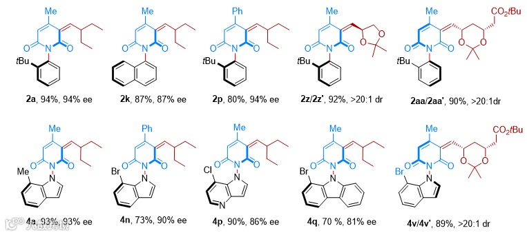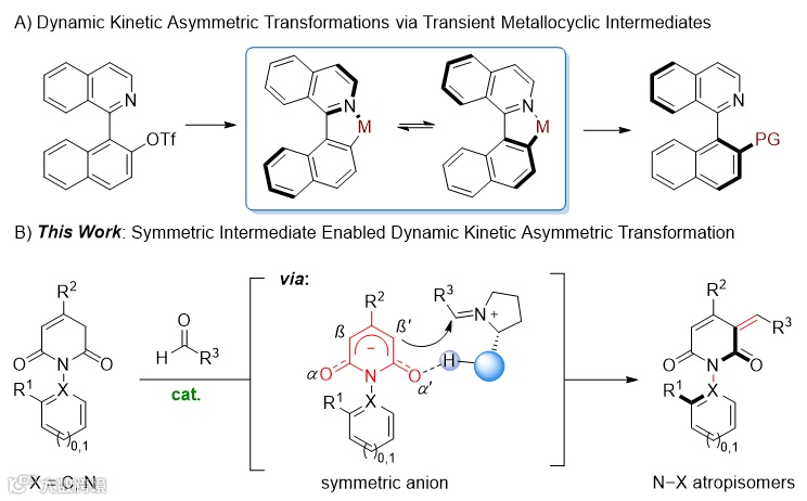 含氮杂环是最重要的一种结构单元,广泛存在于医药、材料以及生物活性分子中。许多氮杂环化合物中存在旋转受阻的N–X轴(N–N或者N–C),并且对分子的理化性质和生物活性具有重要的影响。比如喹诺酮磺酰胺I对钠离子通道NaV1.7的抑制效果是其阻旋异构体的100倍,PDE4抑制剂II比其阻旋异构体具有更高的代谢稳定性,Dixiamycin A (III)对于多种细菌的抑制效果也远高于Dixiamycin B(图1)。尽管氮杂阻旋异构体的不对称合成取得了快速的发展,但目前发展的方法大多只能单一地构建N–C或者N–N轴手性,发展更高效、普适的合成方法以兼容这两类轴手性具有重要意义。