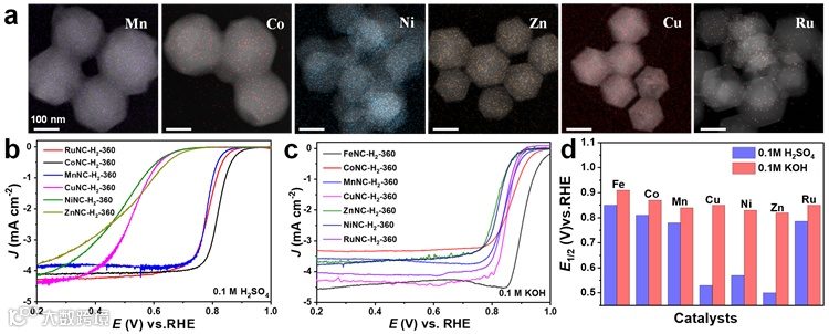 该方法也广泛适用于各种高性能M-N-C材料(M = Fe, Co, Mn, Ni, Zn, Ru)的合成,实现了较高的单原子负载。在相同的合成条件下,通过使用不同金属的氯盐来制备前驱体,均可以在低温下合成包括铁、钴、锰、镍、铜、锌和钌等单原子材料。在EDS映射图像中可见金属元素均匀分布。所有材料在酸性或碱性中显示出优异的ORR活性。团队提出的新方法为单原子材料在可持续能源及催化领域的广泛应用奠定了基础。