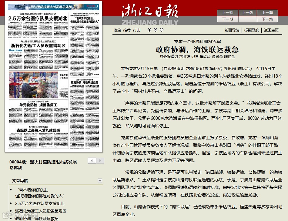 疫情期间,龙游维达纸业因运输企业未复工、运力不足问题导致库存告急、面临停工。王路获悉后积极联络集团、股份公司业务部门,发挥宁波舟山港“海铁联运”优势,帮助企业解决进口木浆物流通道问题,获得龙游县政府和企业的赞誉。相关事迹在人民网、浙江卫视、《浙江日报》、《衢州日报》等媒体报道。