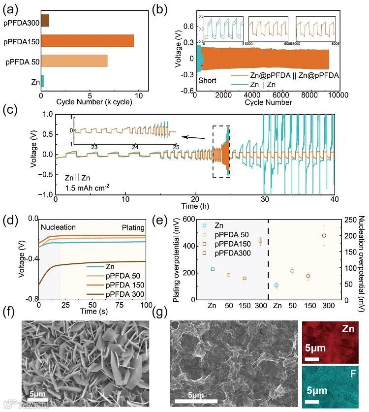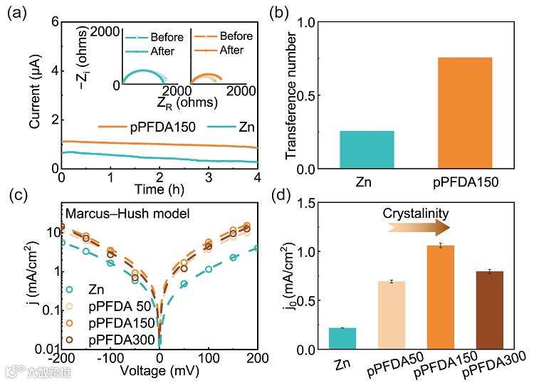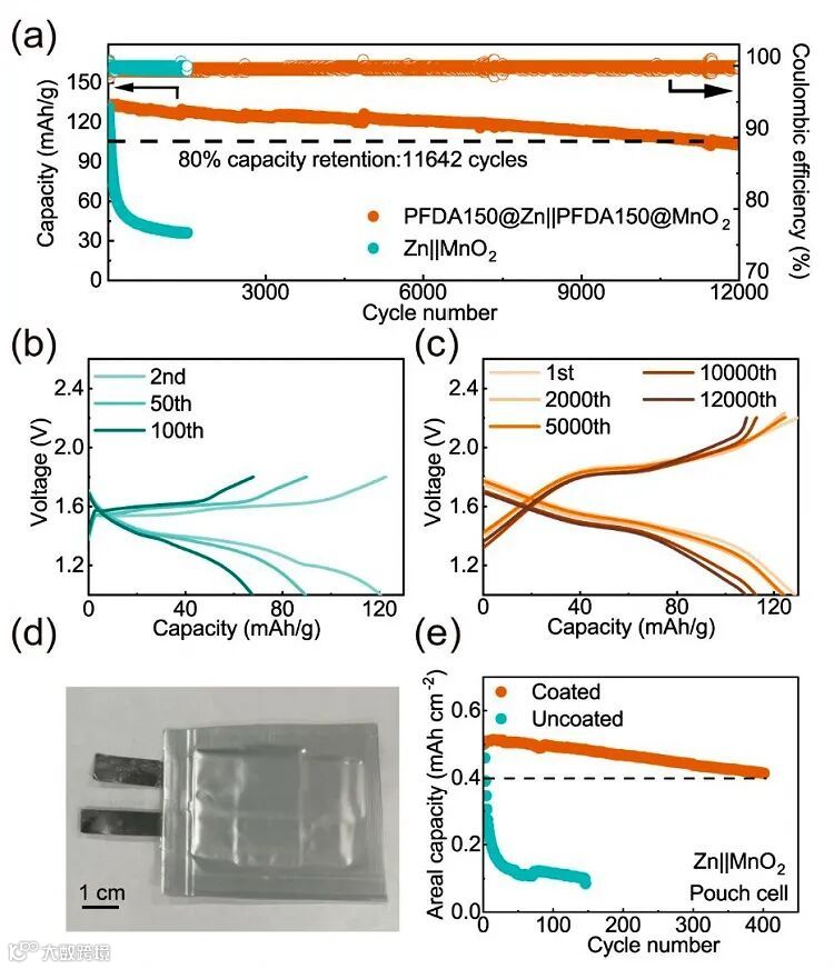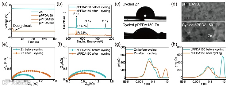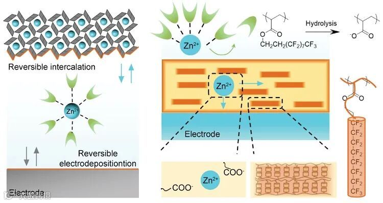 近日,康奈尔大学的杨蓉教授团队与Lynden A. Archer院士合作在J. Am. Chem. Soc.上发表研究论文,他们采用引发式化学气相沉积(iCVD)技术,合成了一层超薄的结晶聚(1H,1H,2H,2H-全氟癸基丙烯酸酯)(pPFDA)作为电极界面。这一界面不仅具有高疏水性,还展现出在水系电解液中自适应地发生水解形成离子通道的能力。同时,该聚合物涂层成功保护水系电池中正负极,实现了稳定循环。通过对反应条件的调控,研究团队优化了聚合物的结晶度,以提高界面的稳定性和离子传输效率。通过采用具有取向结晶的150 nm pPFDA涂层,团队成功实现了锌-二氧化锰全电池高达11,000次的循环寿命,并在软包电池中验证了其性能。这一界面设计不仅在锌离子水系电池中取得了显著的成功,而且在水系电池中具有广泛的通用性。研究人员以铜和锂为例,验证了这种界面在不同体系中实现更高循环稳定性的可行性。论文的通讯作者是杨蓉、Lynden A. Archer;第一作者是陈鹏宇、金硕。