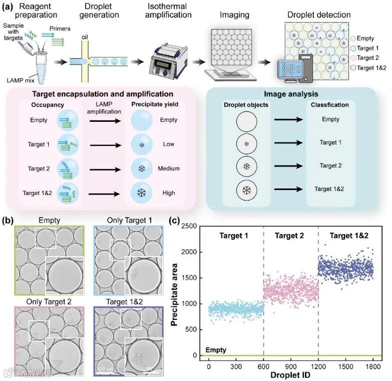 该方法对于两种不同的核酸靶标的特异性引物设置不同的浓度,控制不同的靶标的反应深度不同,从而使不同靶标扩增产生的沉淀量不同。扩增后,在明场下拍摄液滴图像,并利用深度学习算法对于液滴明场图像进行分析,分析液滴中的沉淀形态,从而判断液滴中包含的靶标类型。根据沉淀产量将液滴分为空、仅含靶标一、仅含靶标二、同时含两种靶标等4类液滴。最后根据泊松分布计算样本中每种靶标的浓度。