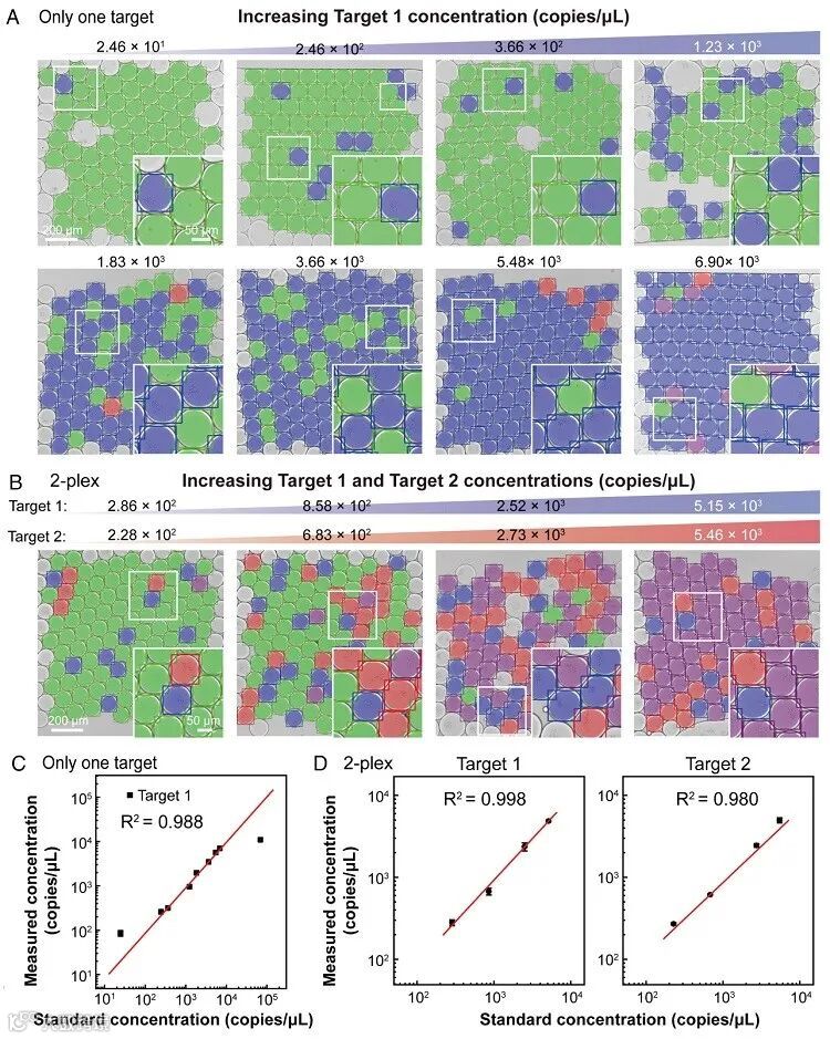 核酸检测在传染病防控和遗传病检测中发挥着至关重要的作用。多重核酸检测技术,能够在单次检测中同时探测多个靶标,提高了检测效率、降低了成本,因而在医学和生物学领域有着广泛的应用前景。然而,目前多重数字核酸检测往往受到荧光标记技术的限制,其对环境要求高、设备昂贵,且荧光试剂可能抑制扩增反应,限制了其实际应用。