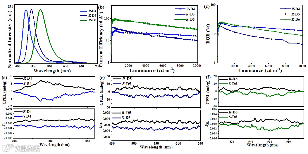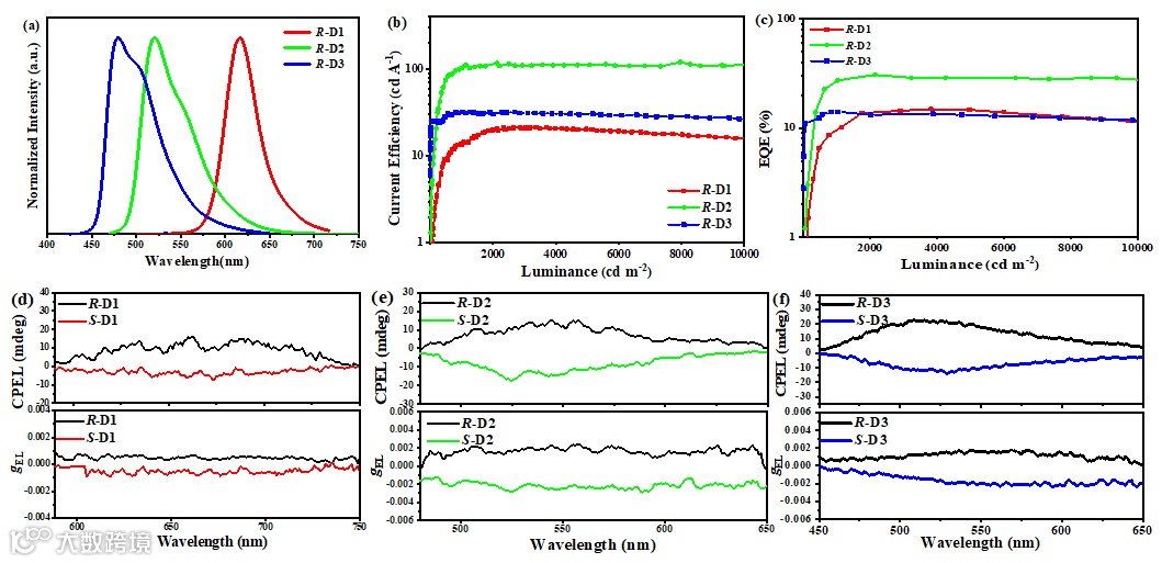 的性能: (a) 归一化的EL光谱, (b) 电流效率 – 亮度曲线, (c) 外量子效率 – 亮度曲线, (d) – (f) CPEL光谱、