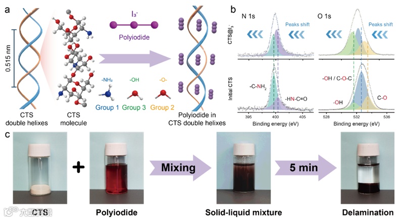 与 CTS 的 N 1s 和 O 1s XPS 图谱 (c) 揭示 CTS 捕获多碘化物过程的照片。