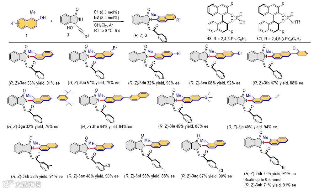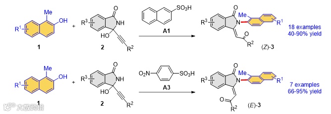 -N阻转异构体的高效构筑 (图3)。他们发现催化剂的酸性对产物的构型影响很大,使用弱酸会形成