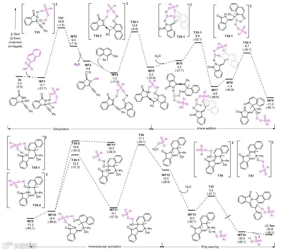 ,其能垒为16.7 kcal/mol。随后,在催化剂作用下发生萘酚的亲核j加成,同时伴随着协同质子转移,生成联烯中间体
