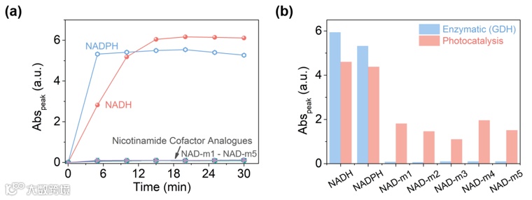 这种优异的再生性能还延伸到了人工辅酶的再生上,本文合成的5种人工辅酶在该光催化反应体系下都得到了高效再生,而GDH无法实现它们的再生。