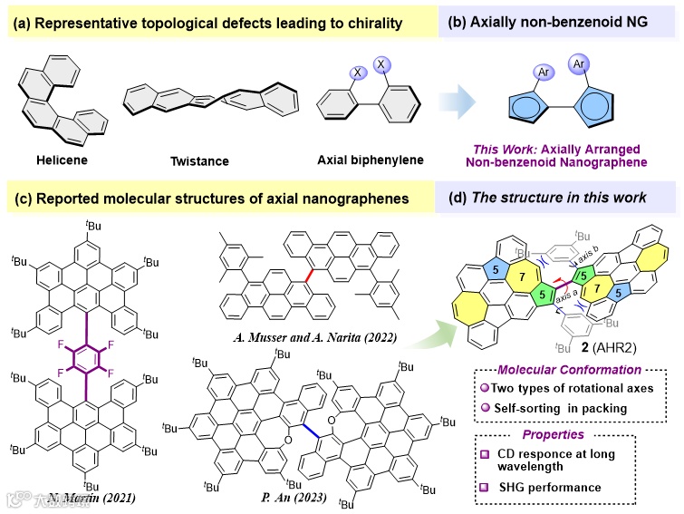 杂化碳原子所形成的共轭平面中的拓扑缺陷。比如,在边缘引入大位阻基团形成扭曲结构、向分子中引入非六元环形成曲率、向分子中引入螺旋单元形成螺烯结构等,均可在共轭分子中引入手性(图1a)。其中,螺旋手性的多环芳烃是研究最多的一类分子骨架。与之相比,轴手性多环芳烃的研究则较为缺乏,至今只有数例报道(图1c)。而且,已报道的轴手性纳米石墨烯分子多为六元环体系,轴手性的非苯型全碳纳米多环芳烃至今未见报道。