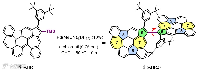 以含有TMS基团的AHR为原料,通过钯催化的C-Si键二聚反应一步合成了具有轴手性的非苯型多环芳烃分子AHR2,实现了10个环系向20个环系的快速扩增