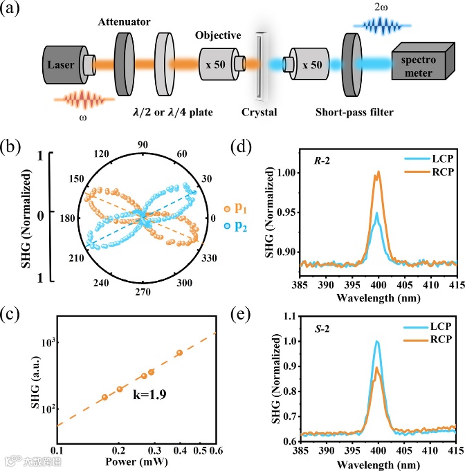 之间的呈现斜率为1.9的线性关系,说明其具有二次谐波(SHG)性质。另外,作者分别生长了手性纯的晶体,它们表现出二次谐波-圆二色(SHG-CD)性质,对左旋和右旋圆偏振光表现出响应差异(图4)。