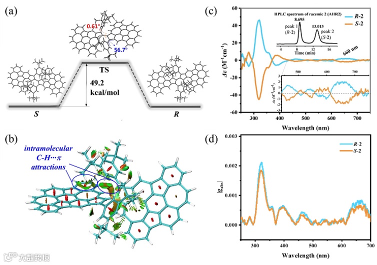 是其手性来源,理论计算表明,一对对映异构体之间的消旋化势垒高达49.2 kcal/mol,围绕在旋转轴