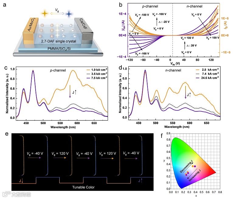 图2. (a) OLETs器件结构示意图;(b) 特性输出曲线和光电流曲线;(c,d) 不同电流密度下的电致发光光谱;(e) n沟道下电致发光颜色可调展示图;(f) 不同电流密度下电致发光CIE色坐标图。