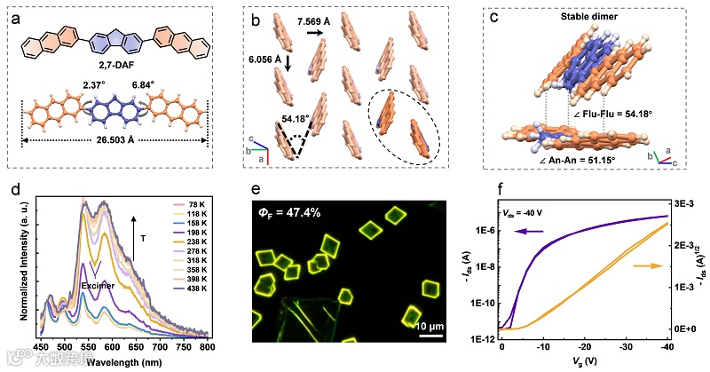 )和强的激基缔合物发光特性,其荧光量子产率为47.4%,其独特的“稳定二聚体”排列方式和鱼骨状堆积结构保证了2,7-DAF分子优异的光电集成特性。更重要的是,