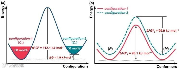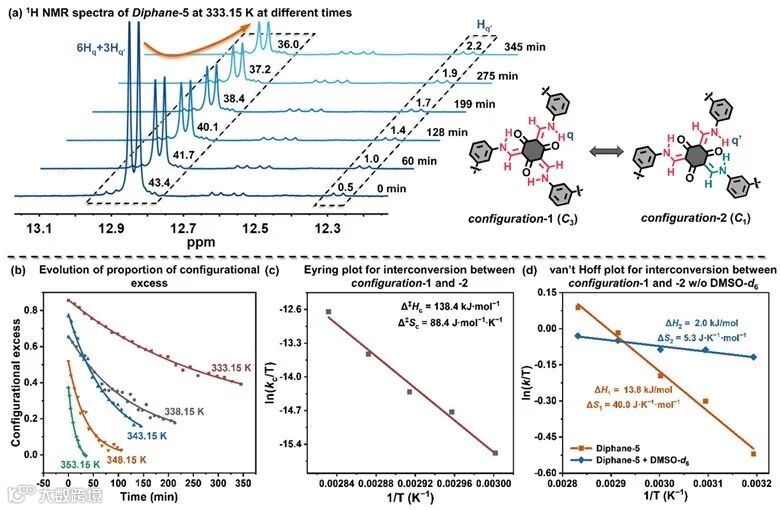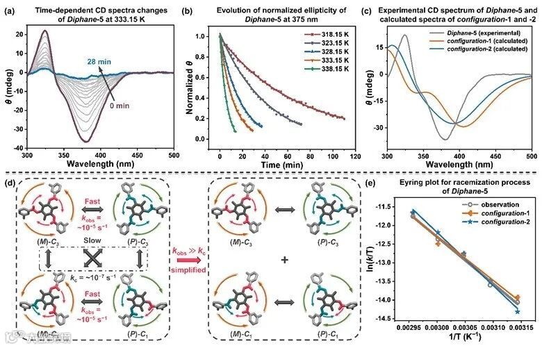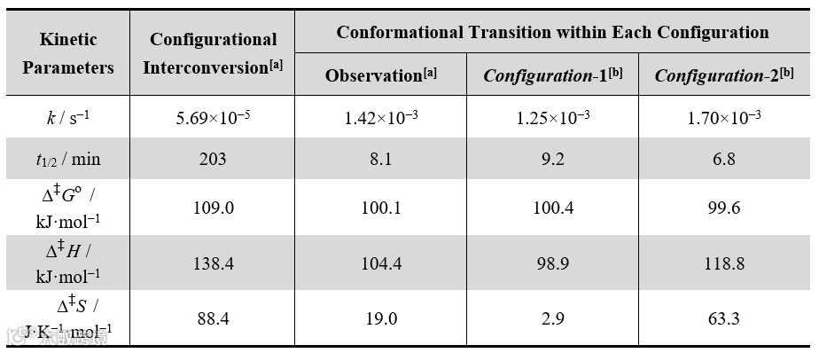 。利用拆解后的方程重新拟合椭率变化,即可得到两种构型外消旋化的动力学参数。在相同温度下,两种构型的外消旋化速率十分接近,与整体外消旋过程的表观速率常数差异很小(如图5(e)所示)。此外,其他动力学参数,如t1/2、Δ‡Go和Δ‡H也非常接近,然而Δ‡S1(2.9 J∙mol−1∙K−1)明显小于Δ‡S2(63.3 J∙mol−1∙K−1),主要归因于结构对称性的差异。