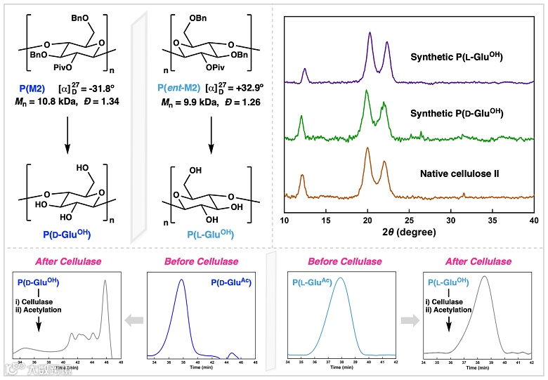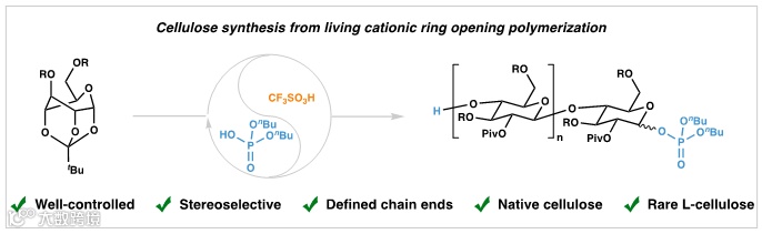 总之,作者利用活性阳离子开环聚合策略,实现了纤维素及其类似物的精确合成。聚合反应具有分子量可控、端基结构确定、立体选择性高的特征。此外,也成功制备了天然纤维素和罕见的L-纤维素,展示了其在生物材料领域广阔的应用前景。
