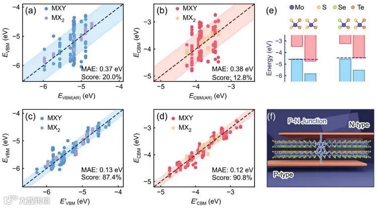 图7. 偶极矩校正模型的准确率,以及通过该模型筛选出来的两种自掺杂材料,MoSTe-MoSTe和MoSeTe-MoSTe。