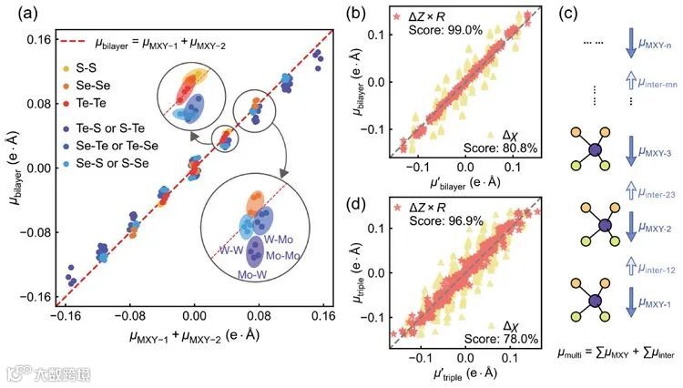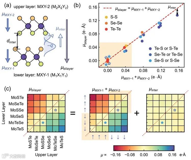 图4. 过渡金属硫族化合物异质结中层内偶极矩和层间偶极矩的相互作用分析。