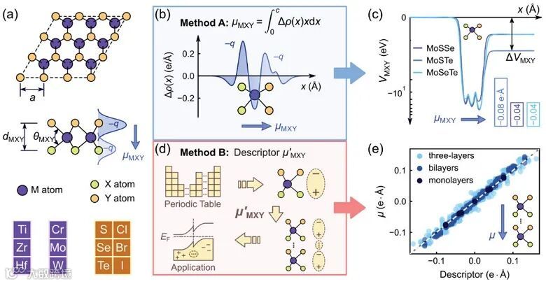图1. 单层过渡金属硫族化合物中的偶极矩。相比于通过电子密度计算的方法(Method A),使用偶极矩描述符预测偶极矩(Method B)具有更高的效率。