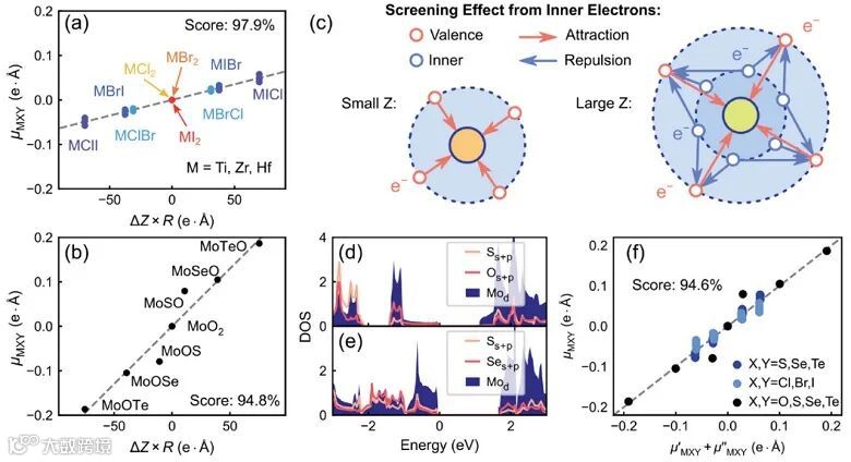 Janus过渡金属硫族化合物包含一系列材料,如2H相和1T相MXY (M = Cr, Mo, W, Ti, Zr, Hf; X, Y = S, Se, Te, Cl, Br, I)。作者发现偶极矩描述符适用于这些体系,但它们具有不同的斜率。考虑到原子屏蔽系数和中间过渡金属原子后,描述符表现出更强的普适性,能够很好地描述所有体系,准确率达到94.6%(图3)。