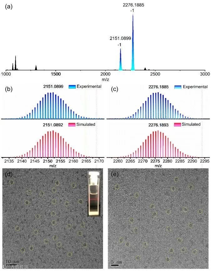 图3. T3-BuSnInCdS在DMF溶剂中的负离子模式质谱及其高分辨透射电镜图
