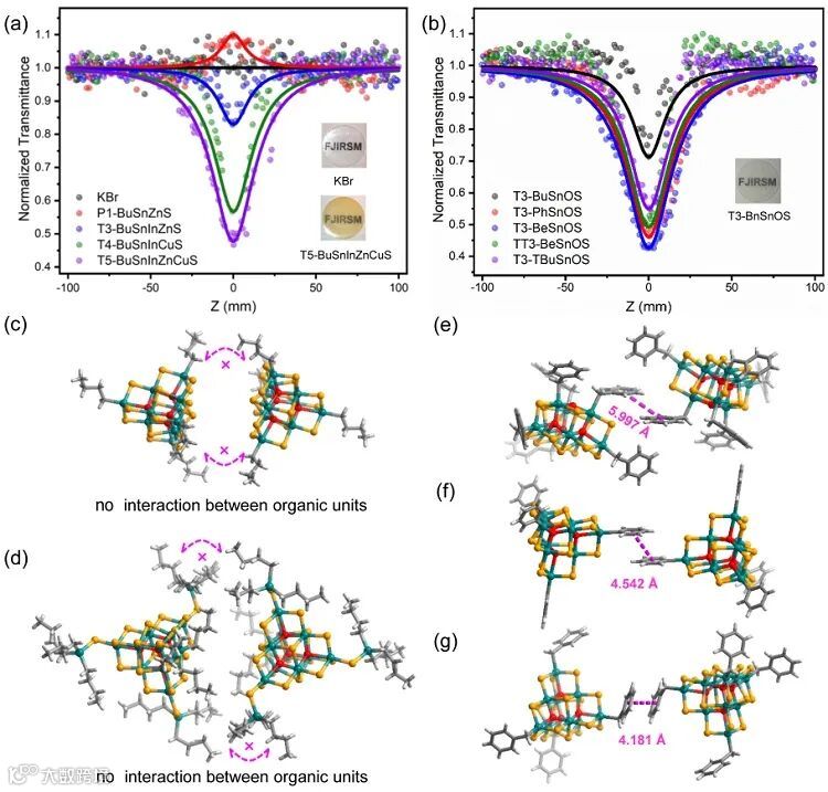 图4. (a,b) KBr和样品的开孔Z扫描曲线; (c,d) 相邻团簇间的相互作用