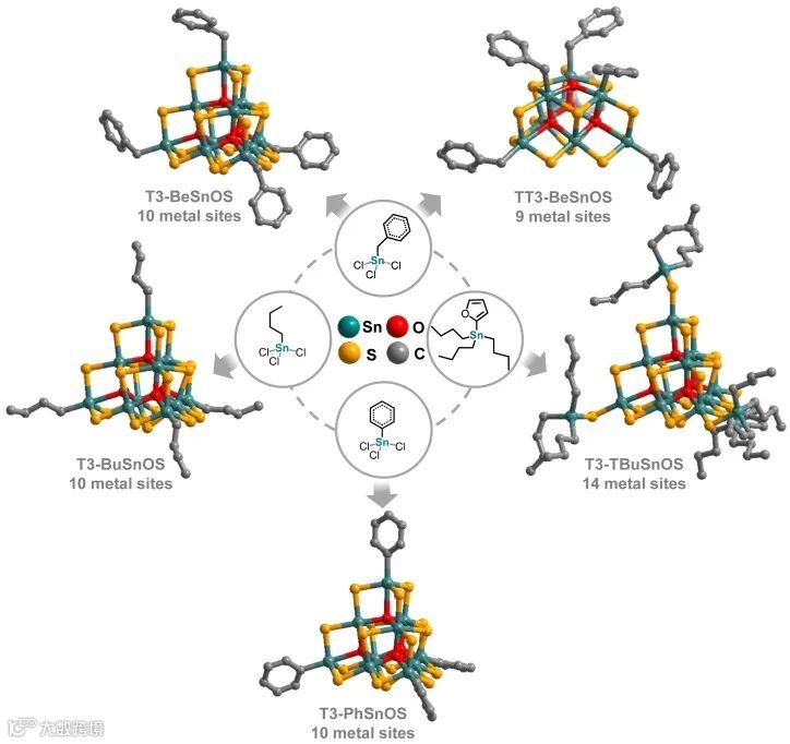引入有机锡不仅可以合理控制尺寸,还能诱导形成不同几何特征的团簇。在T4体系中,改变反应