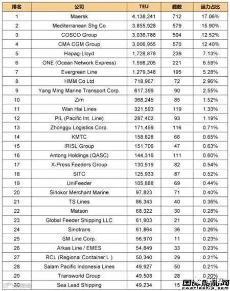 排名第11至20名依次为:万海航运、太平船务、中谷海运、高丽海运(KMTC)、伊朗国航(IRISL)、安通控股、X-Press Feeders Group、海丰国际、UniFeeder和长锦商船。