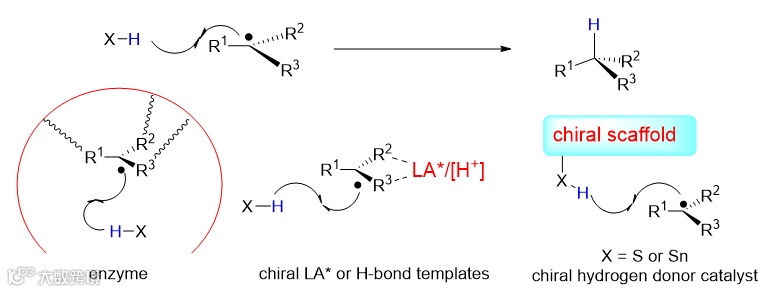 手性分子的对映体往往表现出截然不同的生物活性,在医药、农药、香料和材料领域中有广泛的应用,不对称催化是合成手性分子单一对映体的高效方法。氢原子转移反应虽已存在于生物体内,催化不对称氢原子转移也是高效构建光学活性分子的重要方法,但在生物体外由于催化剂的手性空间与自由基转移位点相距较远,使得手性控制变得困难。如何高效、便捷地实现氢原子向潜手性碳自由基的对映选择性转移仍是一个巨大的挑战(图1)。