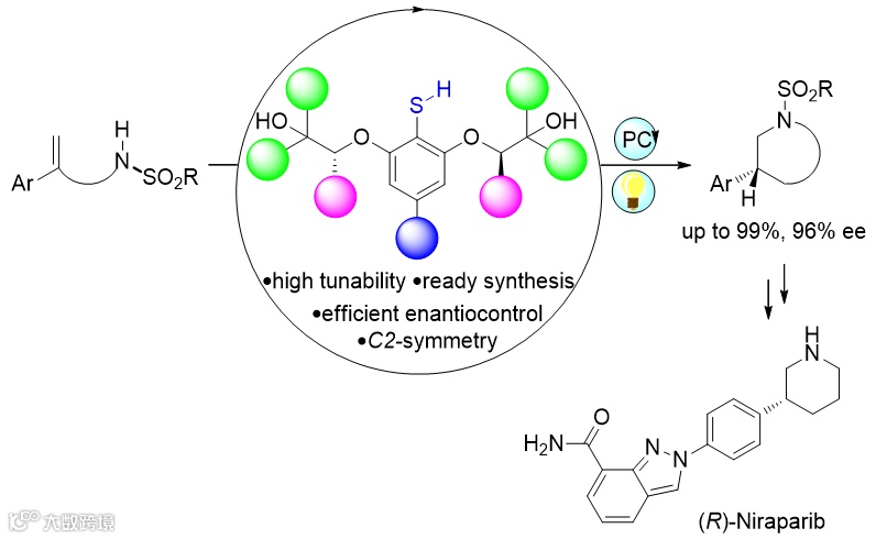 导读:董开武课题组发展了一类C2对称性的新型手性硫酚氢供体催化剂,高区域、高对映选择性地实现了分子内的不对称反马氏氢胺化环化,合成一系列结构丰富的手性哌啶类分子。