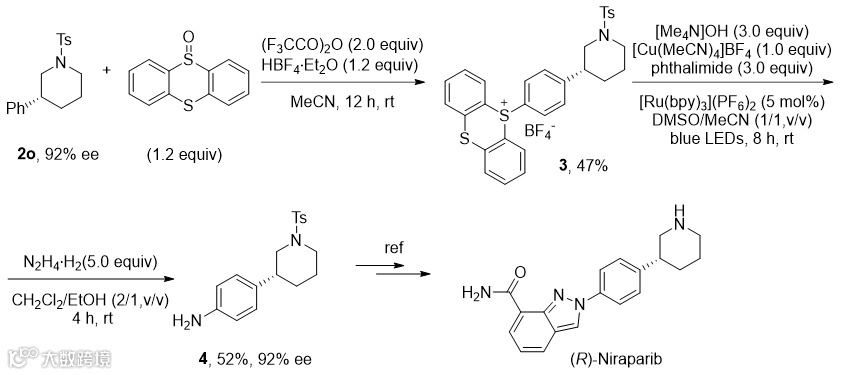 利用该催化方法取得的手性不对称反马氏氢胺化产物结合光驱动金属介导的C-H键胺化,实现了抗癌药物尼拉帕利的形式合成(图3),展示了该不对称氢原子转移方法在生物活性分子合成中的实用性,为相关生物活性分子的多样化构建提供了新