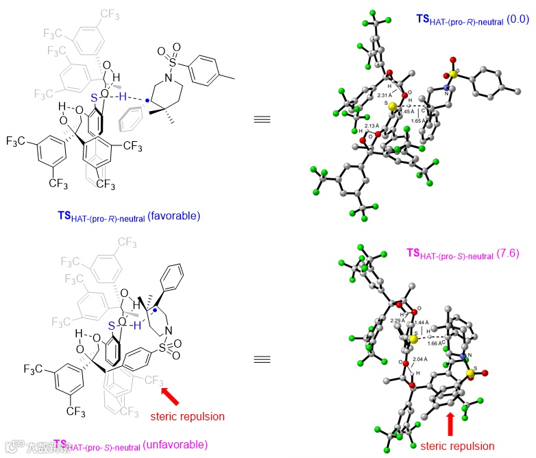 通过理论计算研究了决定反应对映选择性的基元步骤(图4),解释了催化剂与自由基中间之间产生空间位阻的具体来源,揭示了分子中具有稳定邻位交叉构象的手性乙二醇醚结构起到的手性传递作用,结合实验结果阐明了催化剂分子中取代基在对映体选择性上的影响。