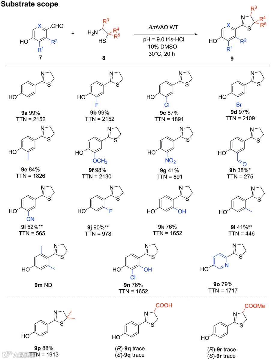 VAO)的催化下,4-羟基苯甲醛和2-氨基乙硫醇能够以99%的产率反应生成2-芳基噻唑啉。考察底物的适用范围,作者发现