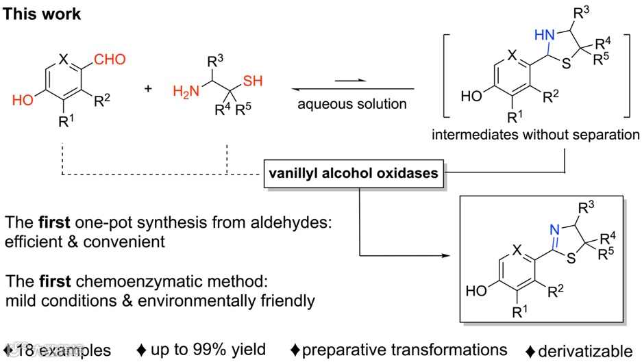 。该方法不仅首次实现了直接从醛出发的噻唑啉一锅法合成,同时拓展了VAOs“新于自然(new to nature)”的催化活性。该化学酶法合成策略具有条件温和,环境友好等优势,可以被应用于含氮杂环药物分子的工业化合成。
