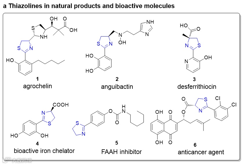 含氮杂环不仅在天然产物中随处可见,同时也是药物分子最为常见的结构之一。其中,噻唑啉结构被发现是一类天然铁载体的核心骨架,某些病原菌可以通过分泌这类铁载体从宿主细胞中摄取铁元素从而产生毒力。受此启发,噻唑啉化合物被广泛应用于输血性铁过载疾病的药物研发,同时该类化合物还被发现具有抗肿瘤、抑制脂肪酸酰胺水解酶等生物活性。此外,噻唑啉化合物在食品工业、农药和材料化学等领域也有广泛的应用。