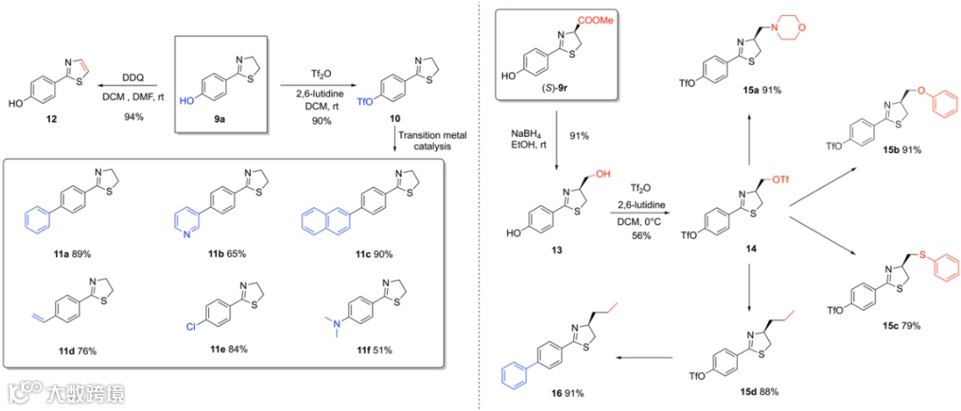 在后续的产物衍生化研究中,对酶反应产物中苯环的酚羟基进行三氟甲磺酰化,随后在过渡金属的催化下,该酚羟基可以转变为芳基、烯基、卤素、氨基等其他基团。类似的,对噻唑啉环上的羧酸甲酯基团进行还原、三氟甲磺酰化和亲核取代,可以引入胺类、醚类、硫醚类等结构,从而实现结构多样的2-芳基噻唑啉的高效合成。此外,噻唑啉环还可以通过氧化芳构化转变为噻唑环,后者在药物分子中也非常常见。