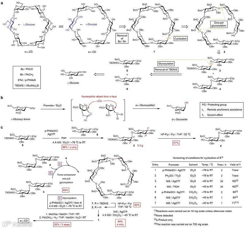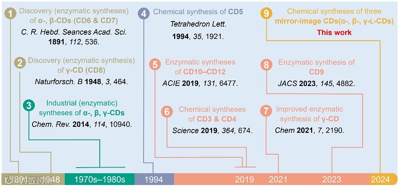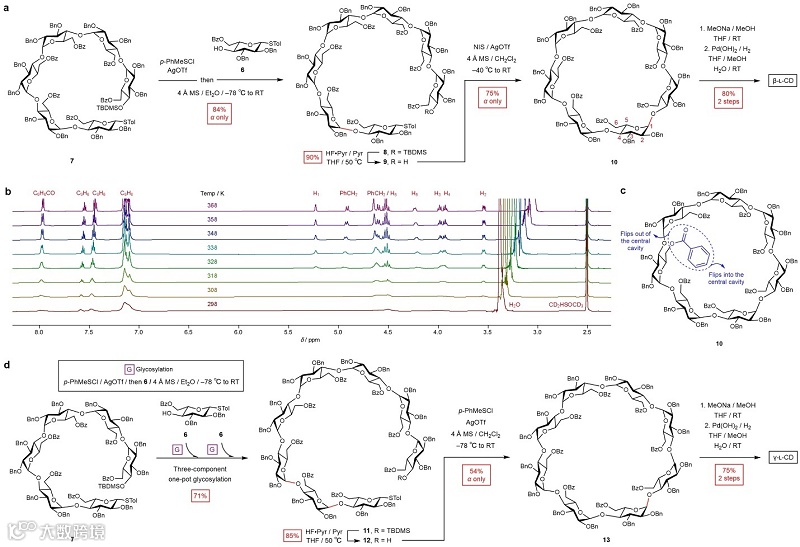 总之,这项工作从简单易得的单糖砌块出发,以至多八步实现了三种镜像环糊精的半克级高效制备,丰富了环糊精研究人员的工具箱,构成了环糊精漫长研究和应用历史中的重要一步。作者预计,由于生物体中的天然酶难以识别镜像环糊精,使其具有比天然环糊精更好的生物稳定性,因而镜像环糊精可能在医药学研究中得到应用。