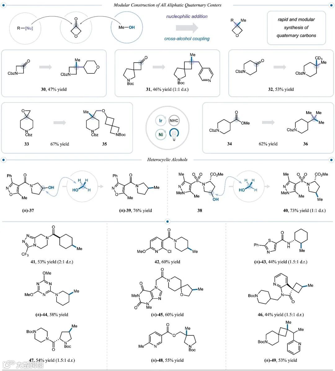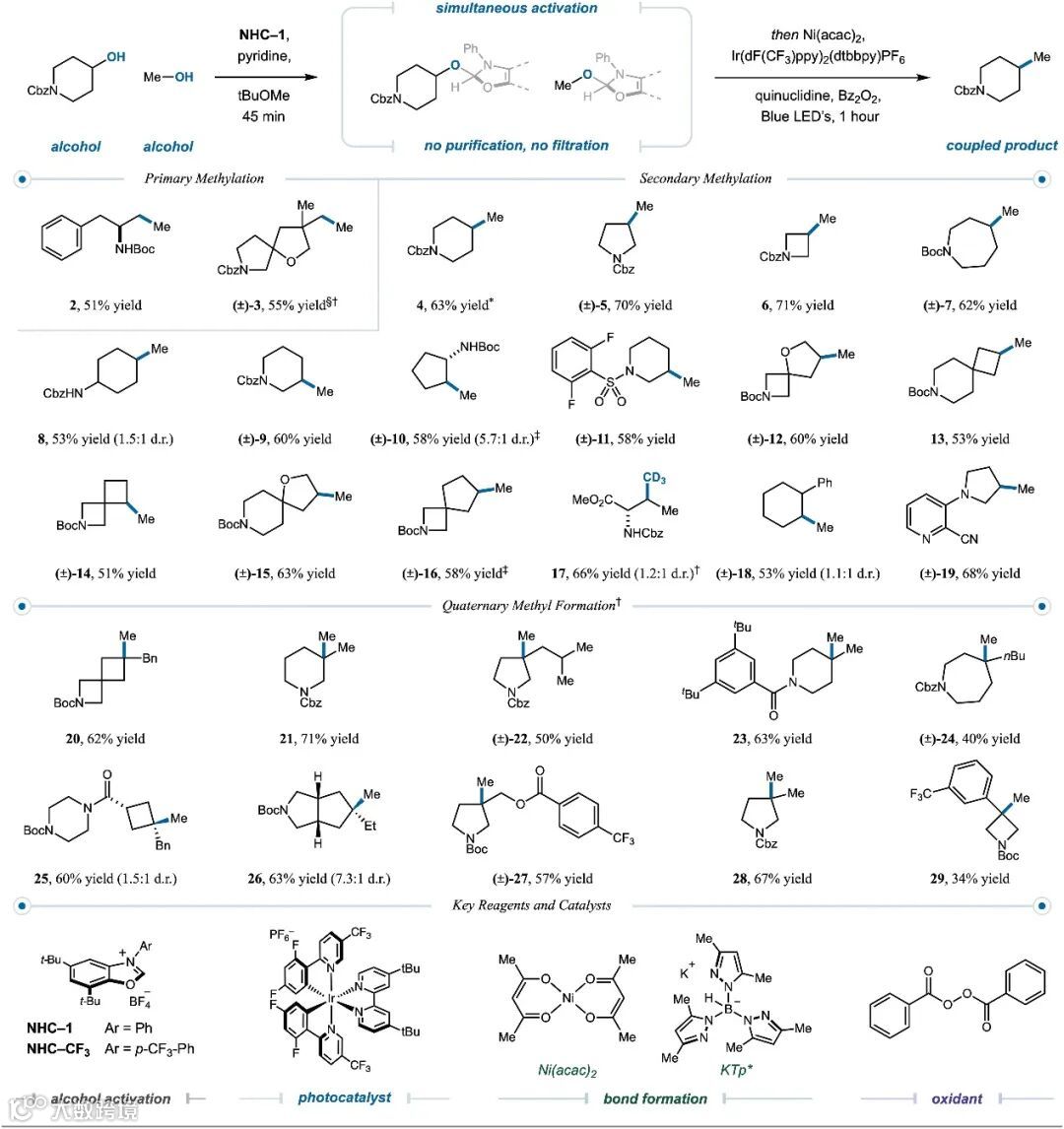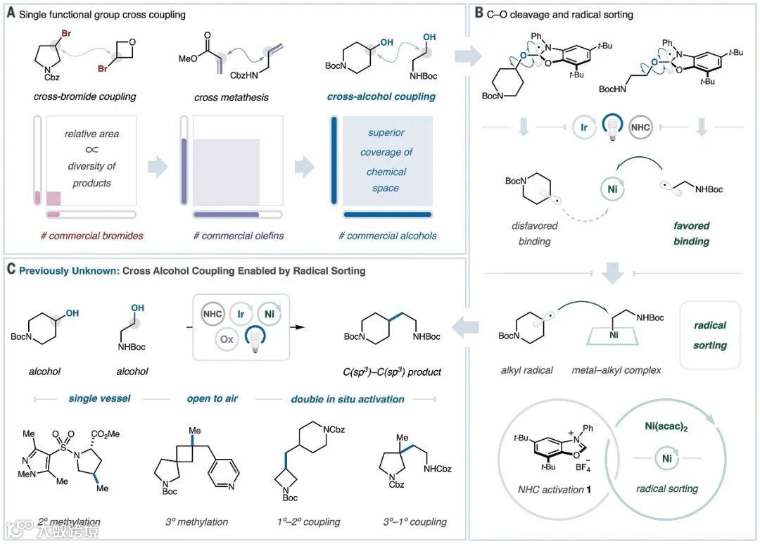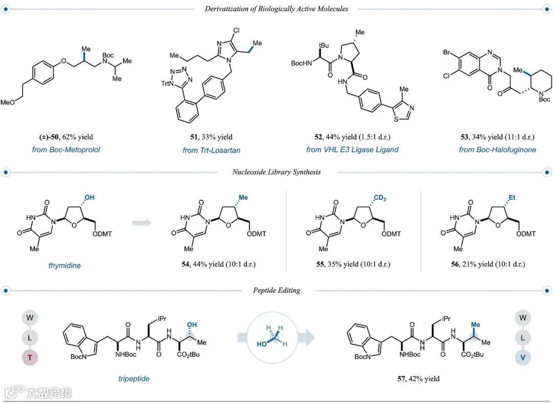 David MacMillan教授课题组利用光/镍催化的SH2自由基分选策略,成功地实现了两种醇之间的C(sp3)-C(sp3)键交叉偶联,并以良好的产率构建了五种不同类别的C(sp3)-C(sp3)键,包括季碳中心。此外,该方法对药物分子、生物活性分子以及多肽的后期修饰同样有效。毫无疑问,该方法为醇交叉偶联技术的发展与应用奠定了良好的基础。