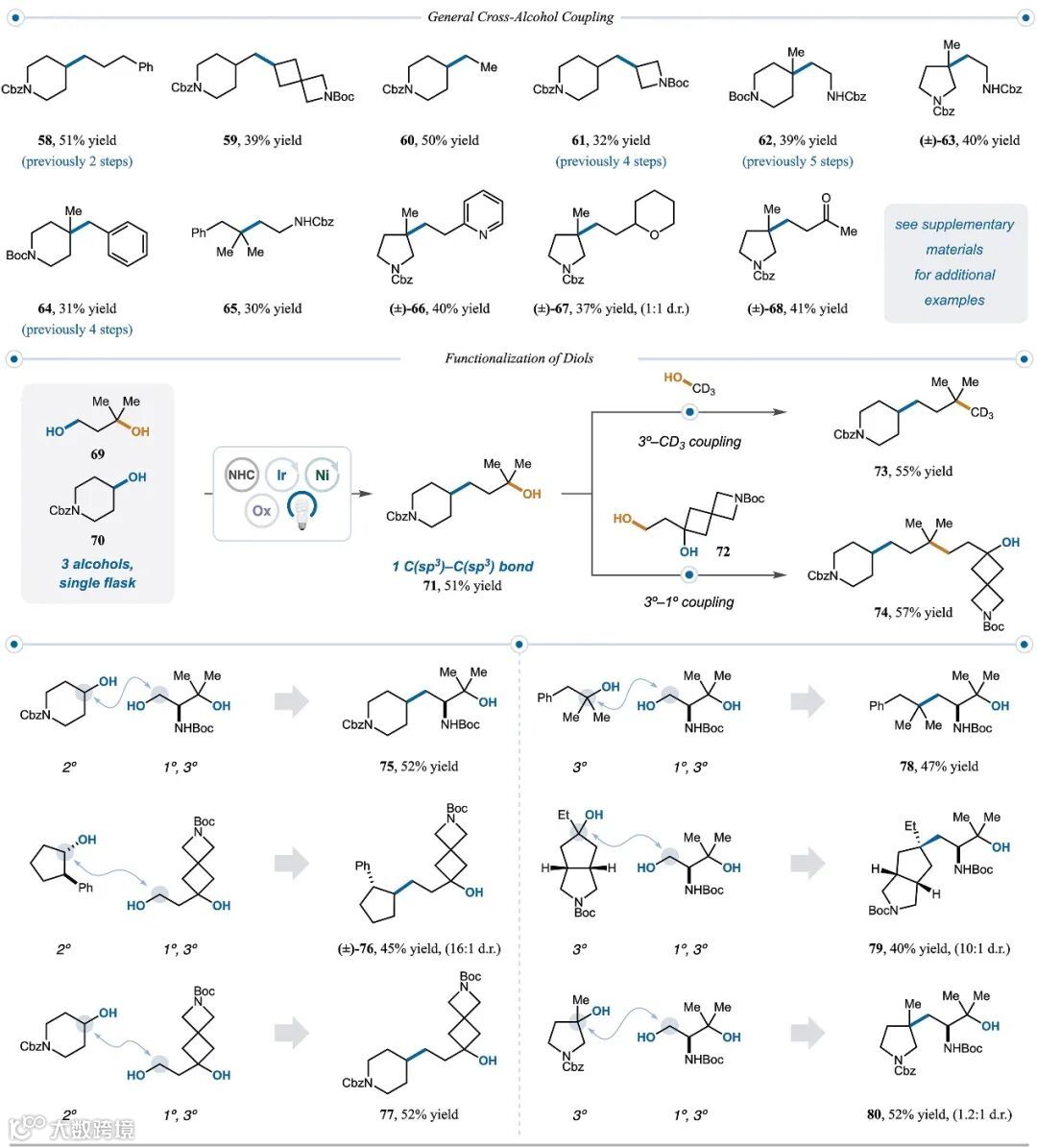 如图5所示,作者还研究了两种不同取代醇之间的交叉偶联反应,结果显示不同环尺寸的2°和1°醇之间均可发生交叉偶联并以32%-51%的产率获得相应产物(58-61),同时环状/非环状3°醇与1°醇也能以30-41%的产率构建相应的季碳中心(62-68)。其次,作者对二醇的迭代官能团化进行了相关研究。由于醇和NHC盐之间的缩合速率由空间位阻决定(MeOH > 1° > 2° >> 3°),因此作者推测差异取代的二醇(如:1°、3°二醇(69)和2°醇(70))可作为交叉偶联的正交功能手柄。事实上,将69和70置于最优条件下,作者发现1°和2°醇发生选择性脱氧并以51%的产率获得含有3°醇的产物71(可单次合成>700 mg)。随后,71中的3°醇可以与CD3OD或72进行另一轮交叉偶联,并分别以55%和57%的产率得到复杂的季碳产物(73和74)。值得一提的是,1°、3°二醇的官能团化被证明非常成功,进而合成了一系列复杂的2°-1°偶联产物(75-77,产率:45%-52%)以及3°-1°偶联产物(78-80,产率:40%-52%)。
