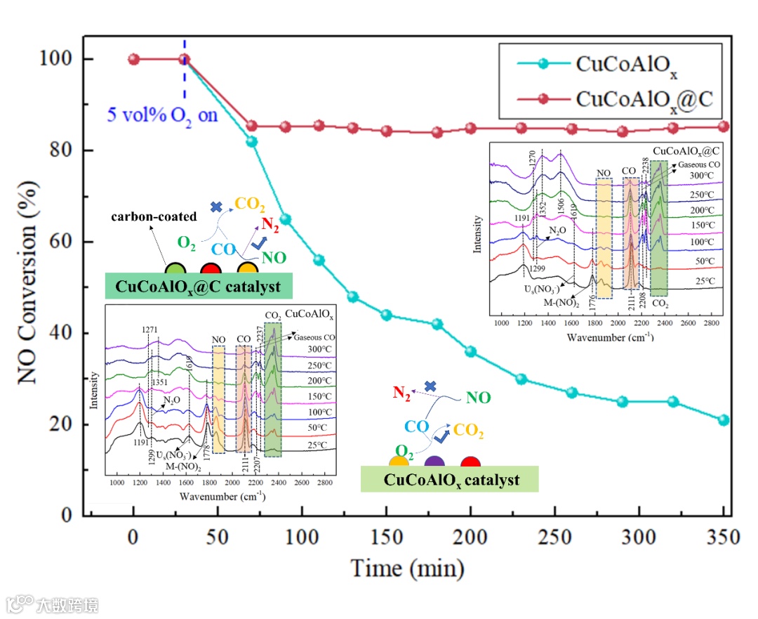,导致还原剂CO的减少,阻碍了CO-SCR反应的进行,使得脱硝转化率急剧下降。对于碳包覆的CuCoAl
