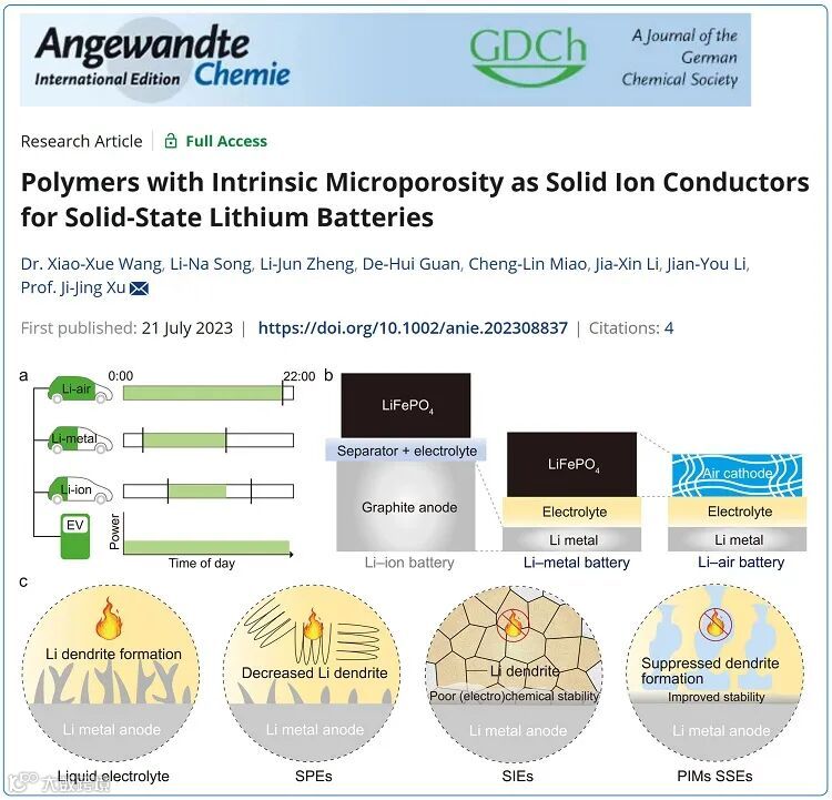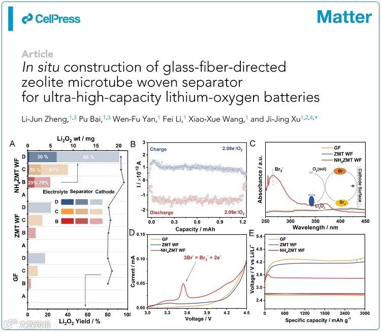 锂−氧气电池发展面临的主要挑战是正极上不规则堆积的绝缘性放电产物Li2O2堵塞氧气、离子和电子的传质通道,最终限制了电池的比容量。为了使正极能够容纳更多的放电产物,提高实际的放电容量,众多研究人员将重点放在了正极材料的微观结构设计和电解液添加剂上,以调节Li2O2的生长行为和形貌,实现大功率放电下的高容量。然而,在正极表面堆积的过多的放电产物会导致过高的充电过电位,进而导致电池能量效率低和循环性能差。因此,如何保证放电产物数量的同时,又不产生对正极钝化的负面影响,是一个看似矛盾但又亟需解决的难题。基于此,该工作受生物矿物组织自组装的启发,采用前驱体支架-固相结晶方法,成功开发了一种具有定制化表面的、三维网络微米管结构的分子筛隔膜。该隔膜得益于分子筛中丰富的埃级孔道和微米管无纺布结构形成的有序离子输运通道,展现出高达2.2 × 10−2 S cm−1的离子传导率。特别是,分子筛隔膜可以结合捕获和转化放电中间体两个步骤,从而将放电反应区域由空气正极拓展至隔膜,大幅提高了锂−氧气电池的放电容量。此外,隔膜优异的热稳定性可有效防止电池短路而引起的着火和爆炸,提升了电池的安全性。基于该隔膜的锂−氧气电池的放电容量高达25100 mAh g−1的超高放电容量、4000次的超长循环寿命和良好的安全性,展示出其在未来储能电池领域广阔的应用前景。该工作发表在国际权威期刊Matter 上,吉林大学郑丽君博士为论文第一作者,徐吉静教授为通讯作者(Matter2023, 6, 142–157)。
